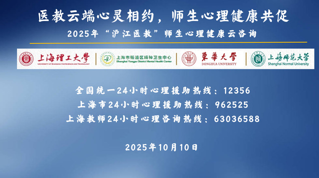 10月10日,在第34个世界精神卫生日来临之际,学校联合杨浦区精神卫生中心、东华大学、上海师范大学共同开展2025年“沪江医教”师生心理云咨询活动。