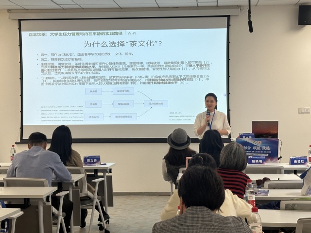 在下午举行的分论坛中,来自不同高校的一线心理健康教育工作人员,围绕“健康教育”、“监测预警”、“咨询服务”、“干预处置”四大主题展开了深入研讨。我校环境与建筑学院王木子老师作了题为《正念饮茶:大学生压力管理与内在平静的实践路径》的专题汇报,系统介绍了我校在融合中华传统茶文化与现代正念技术,开展的“本土化心育实践”的探索。包括课程开发、品牌建设与未来展望,并现场引导了三分钟正念饮茶冥想,得到在场老师的肯定,为大中小学一体化心理育人工作提供了创新思路。