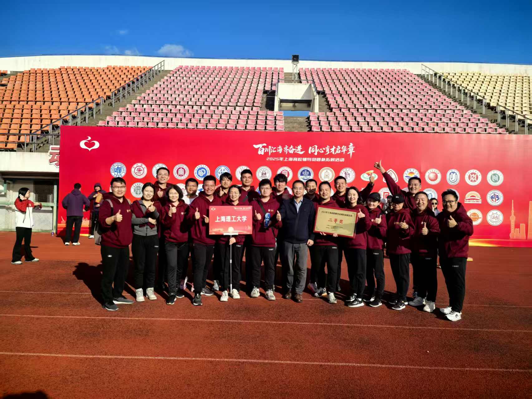 10月25日,由中共上海市教育卫生工作委员会和上海市教育委员会主办、上海海洋大学承办的2025年上海高校辅导员团队拓展活动在临港校区举行。来自全市58所高校的1100余名辅导员同场竞技、共展风采。我校辅导员代表队在副校长岳海洋带领下,凭借出色的协作能力与顽强的拼搏精神,取得总成绩第七名,荣获团队二等奖,同时在“力拔山河”项目中取得单项成绩新突破,获得前八强名次,为学校赢得了荣誉。